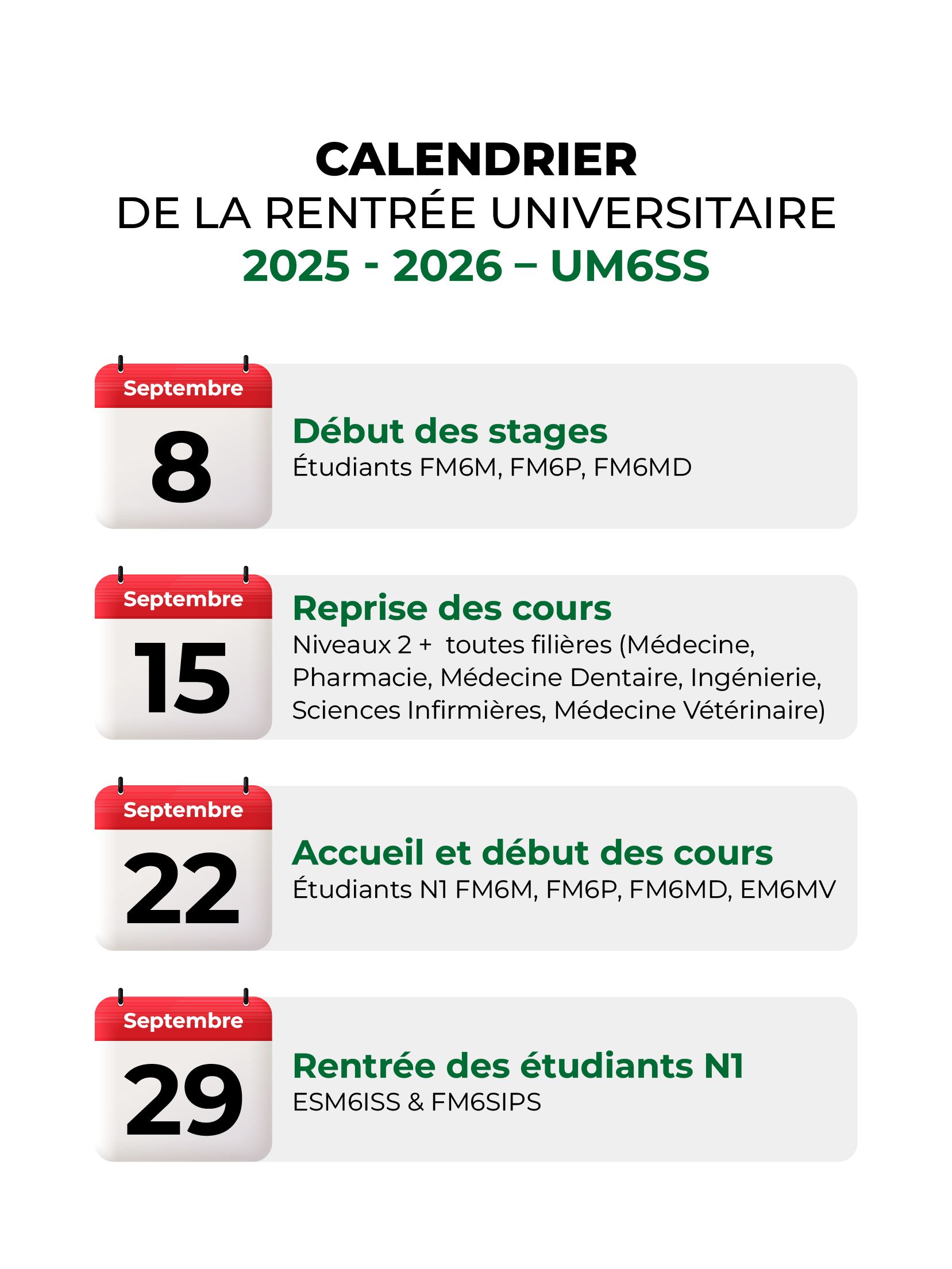 L'UM6SS Rabat, implantée à Madinat Al Irfane, offre des formations en Médecine, Médecine Vétérinaire, Sciences Infirmières et Professions de la Santé, ainsi qu'en Ingénierie en Sciences de la Santé.