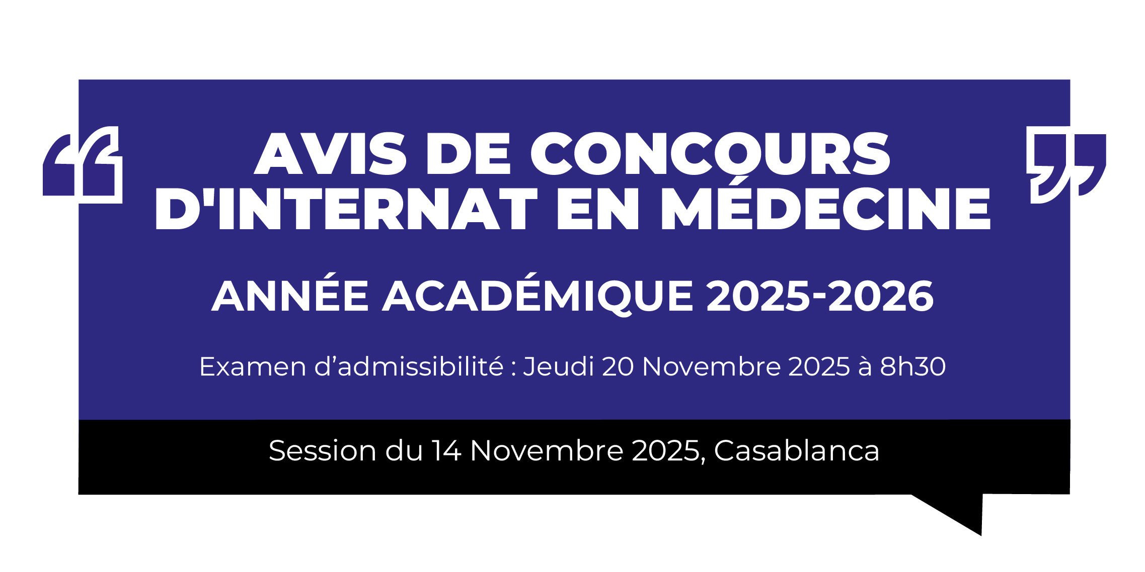 L'Université Mohammed VI des Sciences et de la Santé, par l'intermédiaire de sa Faculté Mohammed VI de Médecine de Casablanca, a le plaisir d'annoncer l'organisation du concours de recrutement d’Internes en Médecine pour l'année académique 2025-2026.