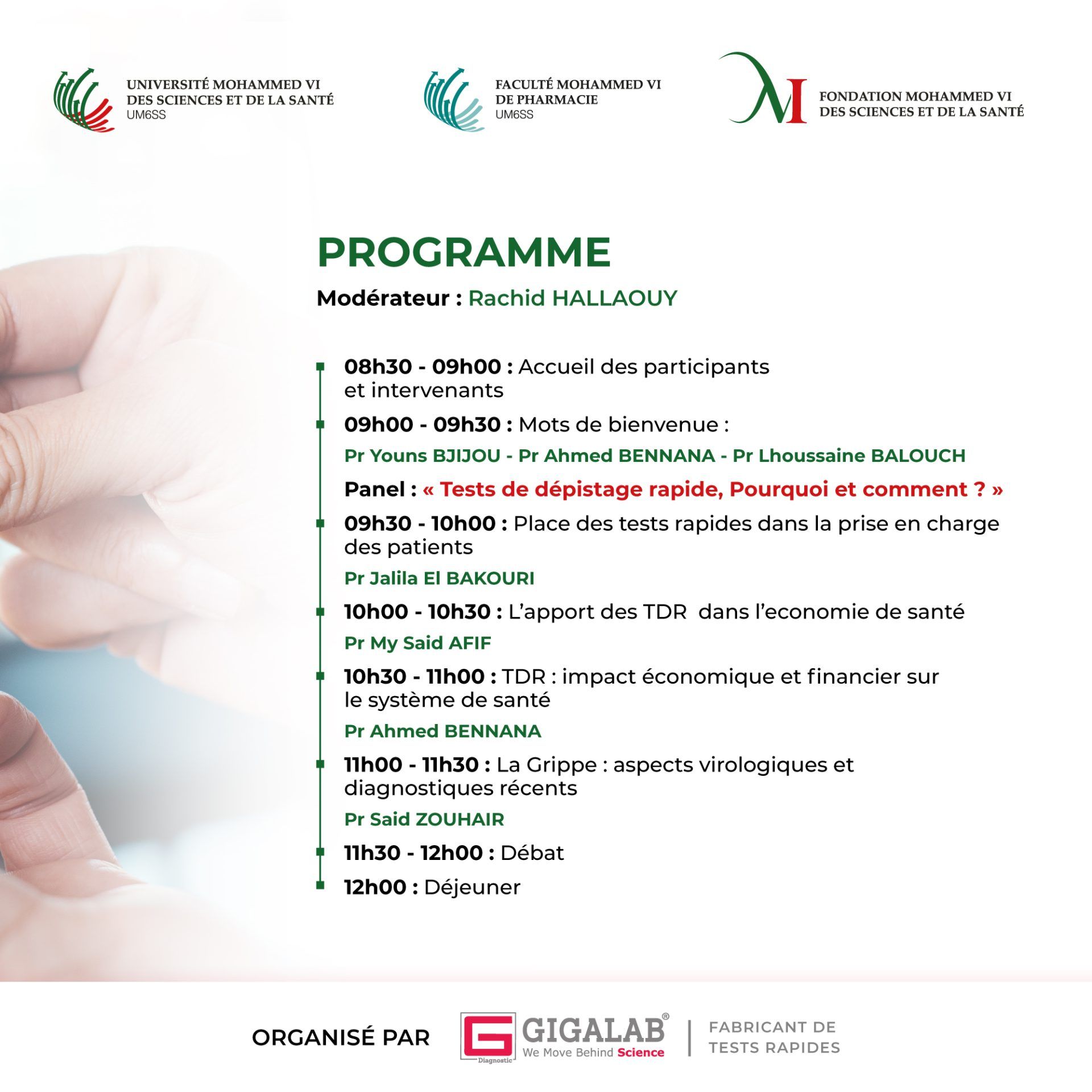 L’Université Mohammed VI des Sciences et de la Santé (UM6SS) et Gigalab Diagnostic s’associent pour organiser un cycle de conférences captivant intitulé « Tests de dépistage rapide, pourquoi et comment ? ». Cet événement aura lieu le 21 novembre 2024 au Centre des congrès Mohammed VI sur le campus Anfa City de l’UM6SS.