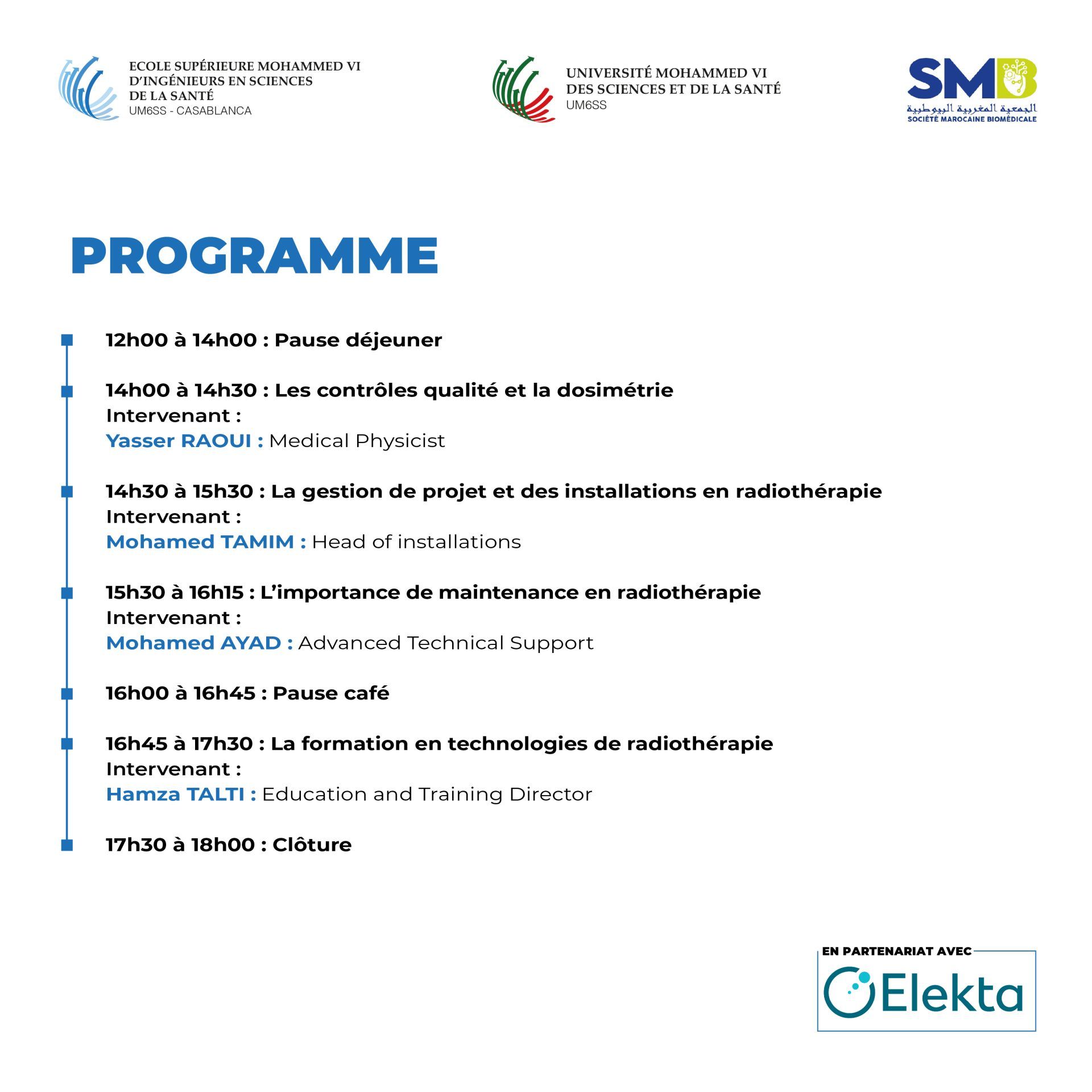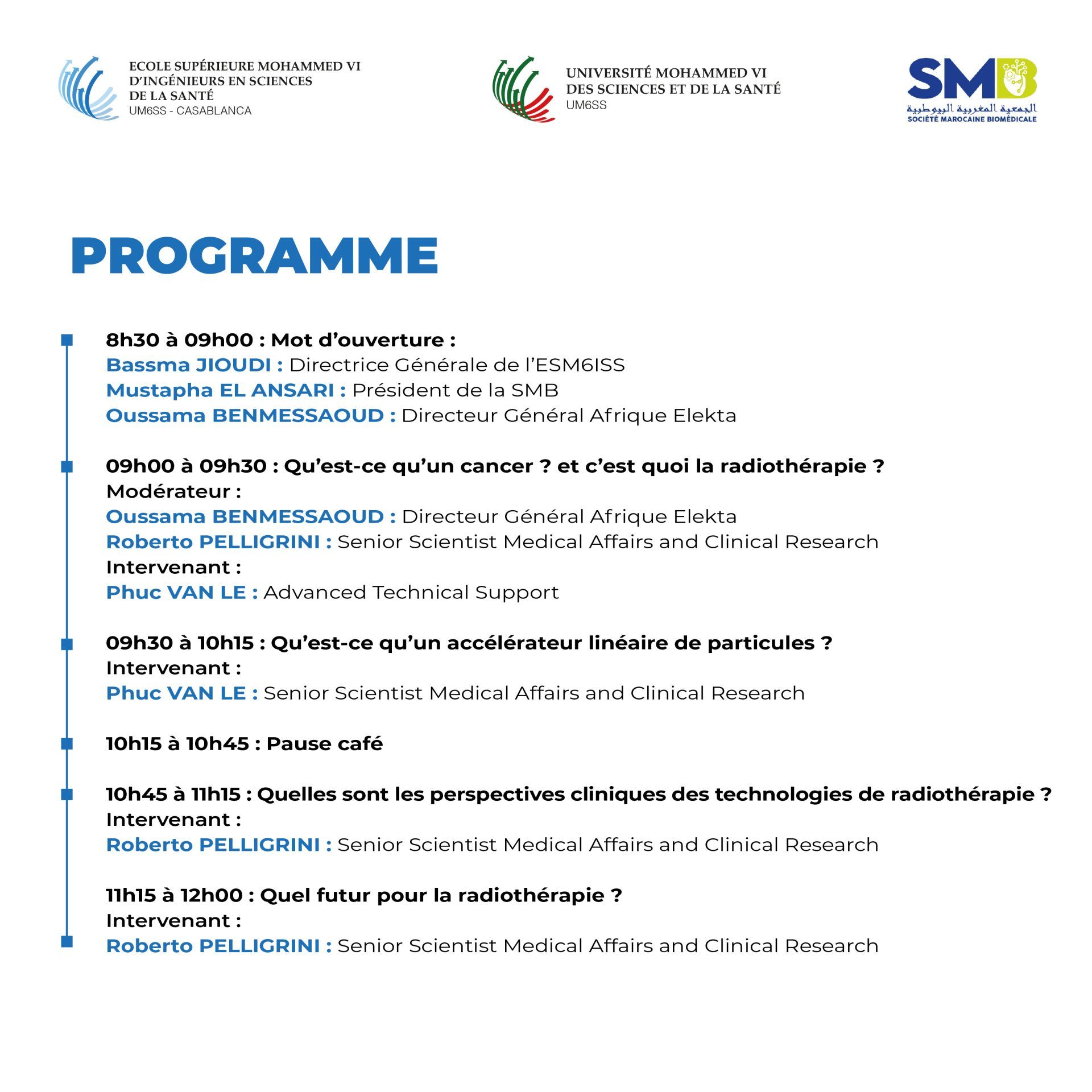 L’Ecole Mohammed VI d’Ingénieurs en Sciences de la Santé (ESM6ISS) de l’Université Mohammed VI des Sciences et de la Santé et la Société Marocaine Biomédicale (SMB), en partenariat avec Elekta sont fières d’annoncer la tenue d’un séminaire captivant sur les innovations technologiques en radiothérapie, qui se tiendra le jeudi 19 décembre 2024 au Centre des Congrès Mohammed VI de l’UM6SS.